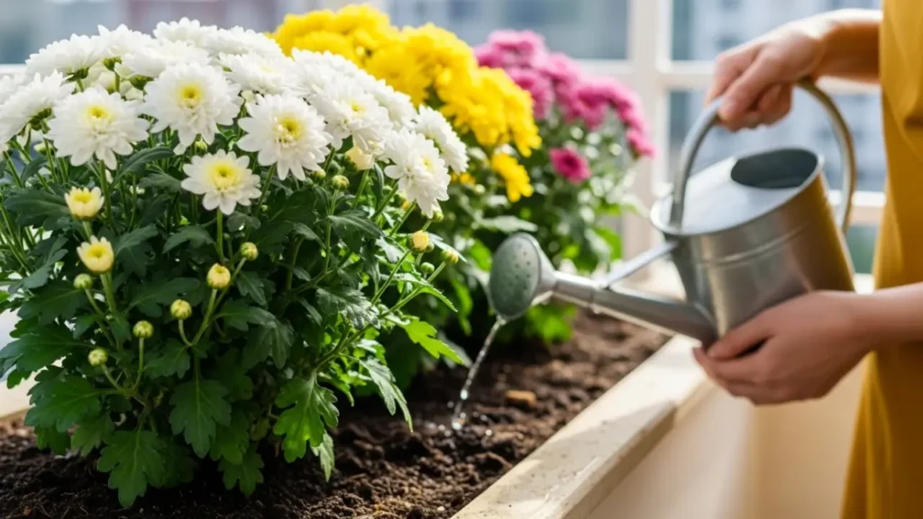 O crisântemo precisa de umidade constante, mas não gosta de solo encharcado. O excesso de água pode apodrecer as raízes.