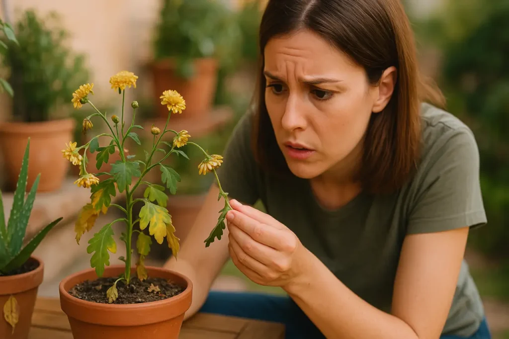 Se o crisântemo está no mesmo vaso há mais de um ano, ele pode estar apertado ou com solo esgotado. Isso afeta diretamente sua vitalidade.