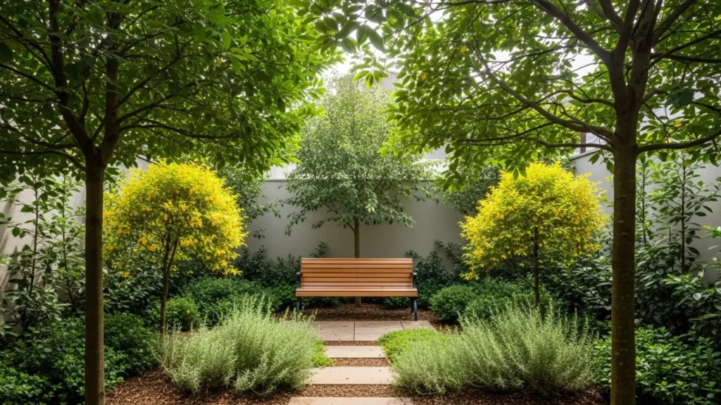 Você pode combinar árvores de pequeno porte com arbustos e forrações como capuchinha, boldo e até ervas medicinais.