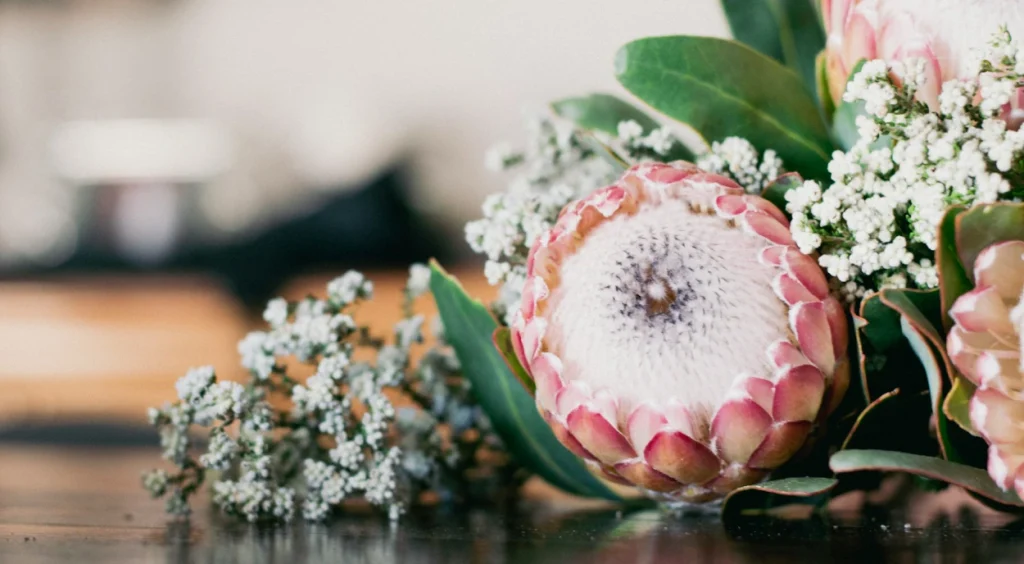 As flores da Protea podem chegar a até 30 cm de diâmetro, com colorações que variam entre tons de rosa, vinho, creme e branco. O formato lembra uma coroa, o que reforça sua imagem de majestade natural.